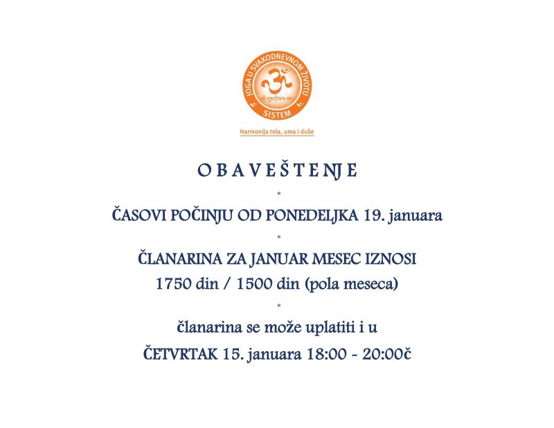 Joga časovi počenju od ponedeljka 19. januara